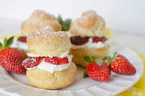4. To fill, fit a pastry bag with a 1/4″ diameter star tip. Fill bag with whipped topping. Divide strawberries evenly among bottom halves of puffs. Pipe or spoon 2 tablespoons topping over each filled half. Place tops on puffs and serve.